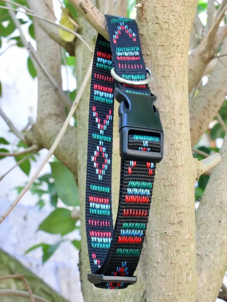 Apportez à votre chien un collier unique et confortable, entièrement fait main en France. Ce collier en sangle tissée motif Aztèque allie artisanat, style et solidité. Il accompagnera votre compagnon au quotidien avec élégance et sécurité.
